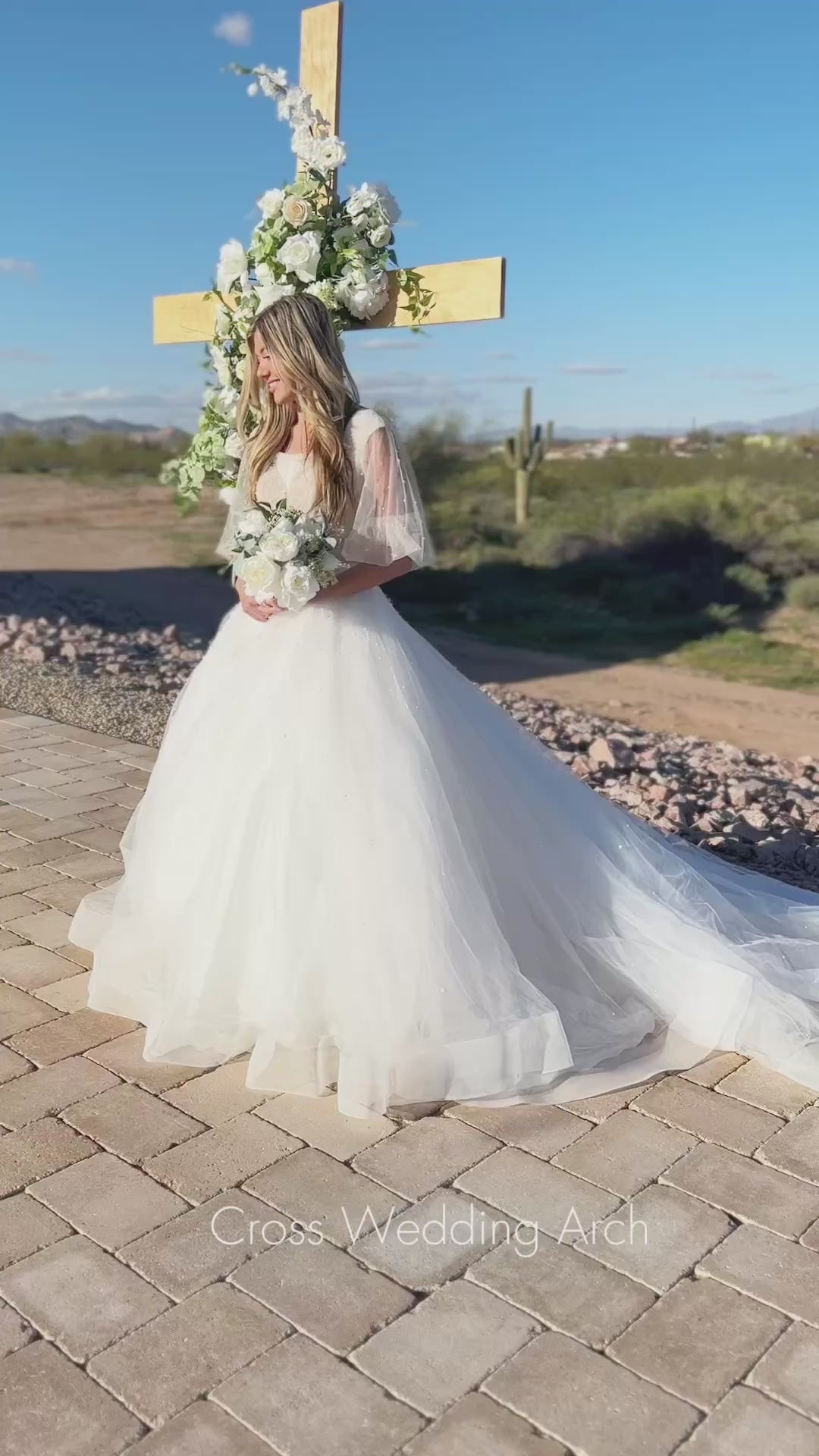 This artisan cross made of the highest quality birch, hand-picked from numerous stores for grain and color, is the perfect addition for any outdoor or indoor wedding. We added a stunning display of white playa blanca roses, white ranunculus, ivory spray roses, ivory veronica, and sage eucalyptus, with touches of clematis draping down the sides.